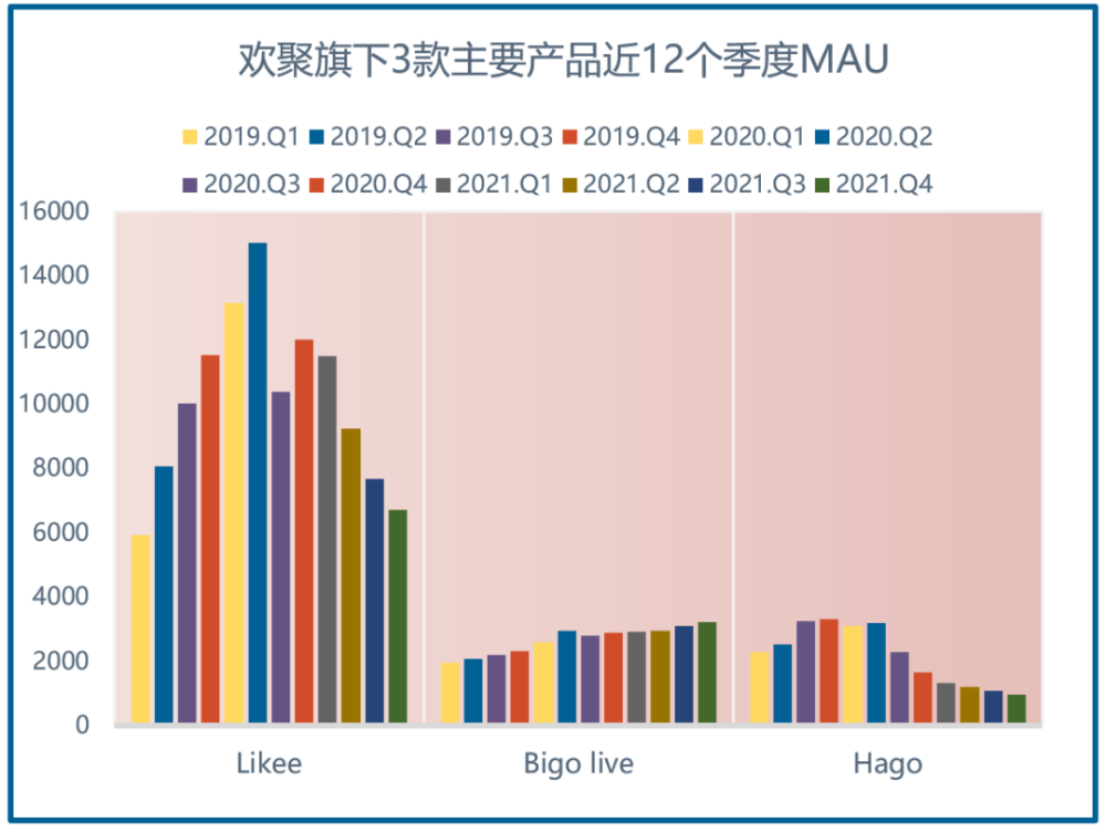 根據財報數據,截止到 2021 年 Q4 歡聚集團 MAU 為 2.8 億,同比下降 20.4%,環比下降 3.1%,下降的主要原因是營銷預算縮減導致的 Likee 和 Hago 用户減少。好消息是,Bigo Live 的 MAU 仍處於正向增長當中。