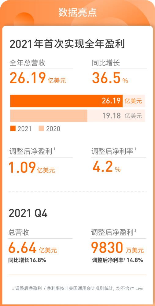 北京時間 3 月 16 日,歡聚集團發佈了 2021 年 Q4 財報以及全年財報。財報顯示,2021 年集團首次在非 GAAP 準則下實現全面盈利。或是與此有關,也乘中概股今天整體回暖的東風,截至發稿,股價上漲 45.22%。