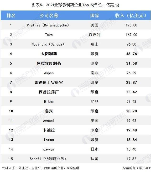 據國際政府基準測試協會(IGBA)數據顯示,全球仿製藥滲透率前5名的國家中,印度以97%的滲透率排名第一。截至2021年印度擁有60個治療類別的60000個仿製藥品牌,是全球最大的仿製藥供應商,佔全球供應量的20%。在全球Top15仿製藥企業中,就有七家企業屬於印度。