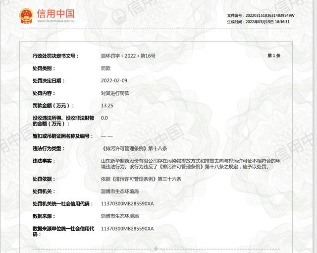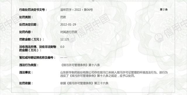 而控股子公司淄博新華-百利高製藥有限責任公司則因「存在污染物排放方式和排放去向與排污許可證不相符的環境違法行為」,在2022年2月被淄博市生態環境局處以罰款8.1875萬元。