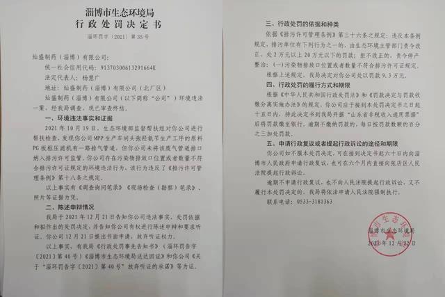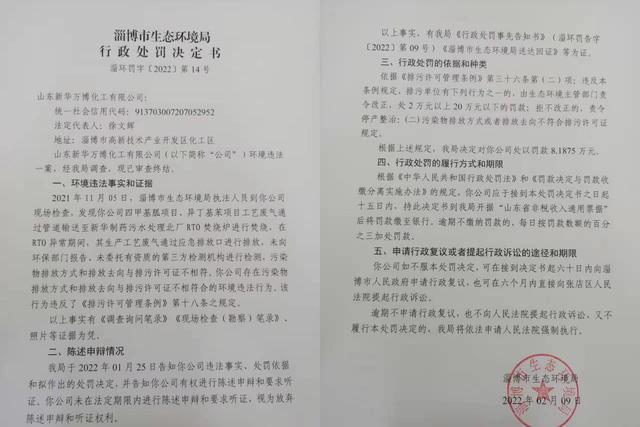 同樣是在2022年1月和2月,新華製藥(000756)的全資子公司山東新華萬博化工有限公司因重污染天氣橙色預警期間、臭氧二級管控期間「未落實應急管控措施」,「存在污染物排放方式和排放去向與排污許可證不相符的環境違法行為」,被淄博市生態環境局處以罰款,分別涉及金額8.75萬元、8.1875萬元。