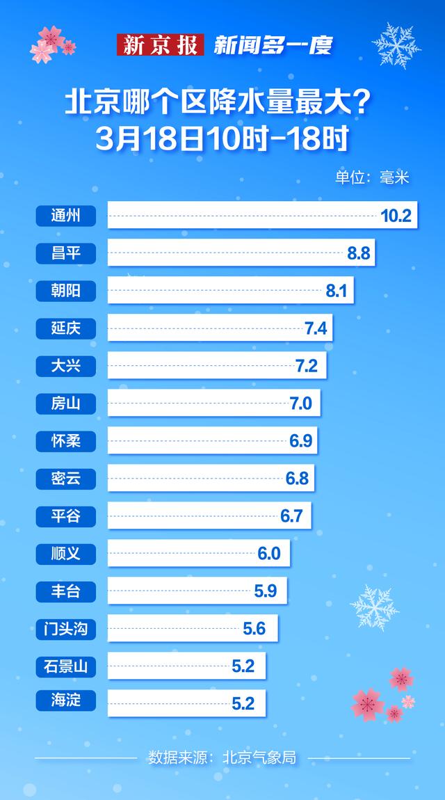 3月18日,京津冀一帶的降雪從上午10點左右開始,自西向東展開。截至18日16時,北京全市降雪量5.1毫米,已經達到大雪量級。北京城區4.2毫米。最大降水量延慶龍慶峽10.6毫米,達暴雪量級。北京發佈暴雪藍色、道路結冰黃色和大霧黃色預警。