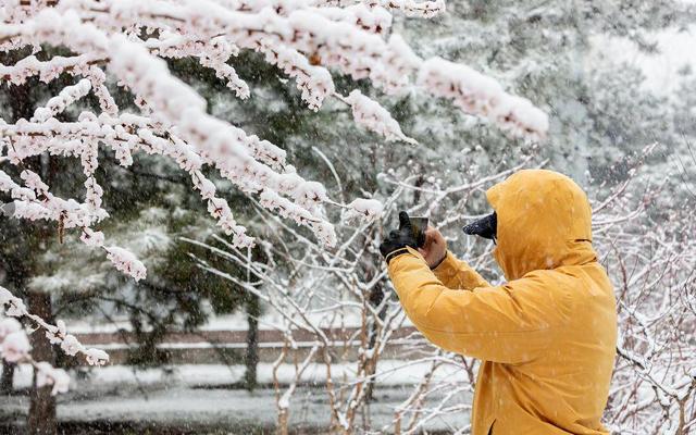 街邊盛開的桃花、玉蘭、迎春等都覆蓋上了一層厚厚的雪被。路人被春花雪景迷住了,紛紛拿出手機拍照留念。