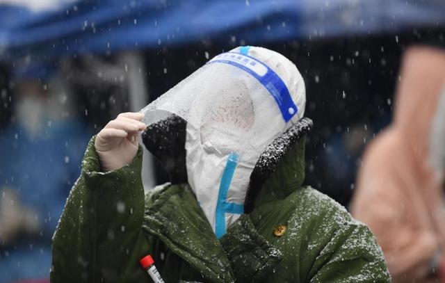 3月18日,南館公園,醫護人員雪中堅守崗位,防護面罩沾滿霧氣。