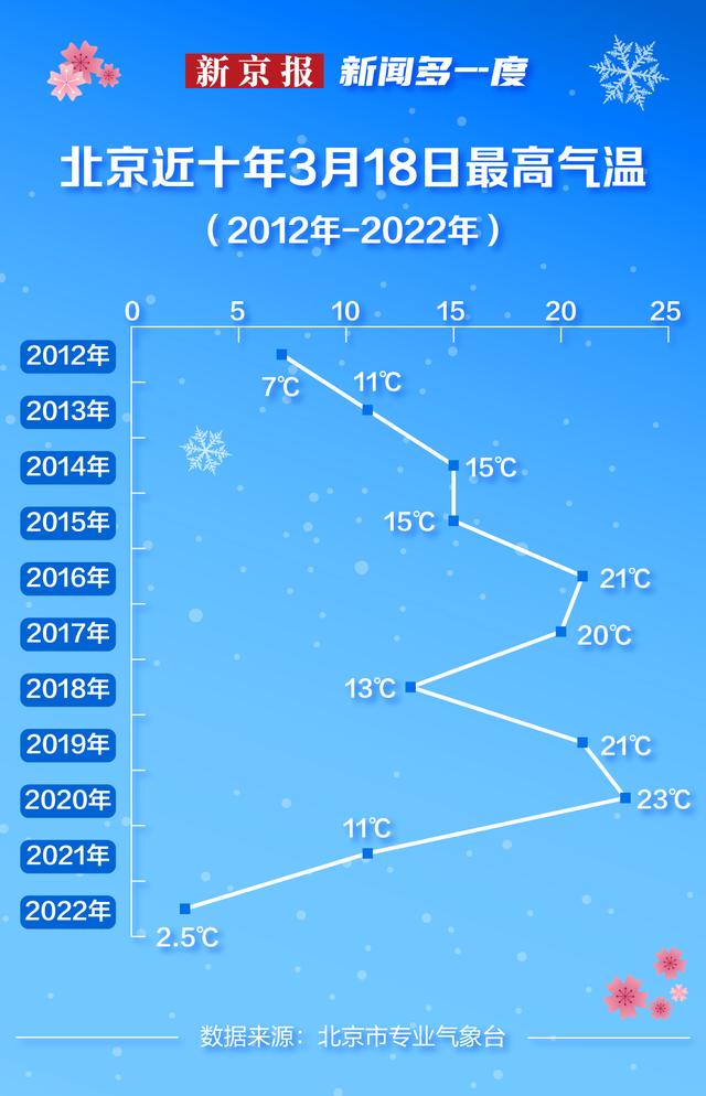 春分時節將至,北京迎來明顯降雪。 繼3月17日全城飄雪,3月18日北京又迎來明顯降雪,氣温也進一步下跌。北京3月18日白天觀象臺最高氣温為2.5℃,為近40年來同期第二低(近40年3月中旬觀象臺日最高氣温的最低值為2.2℃,出現在1980年3月12日)。