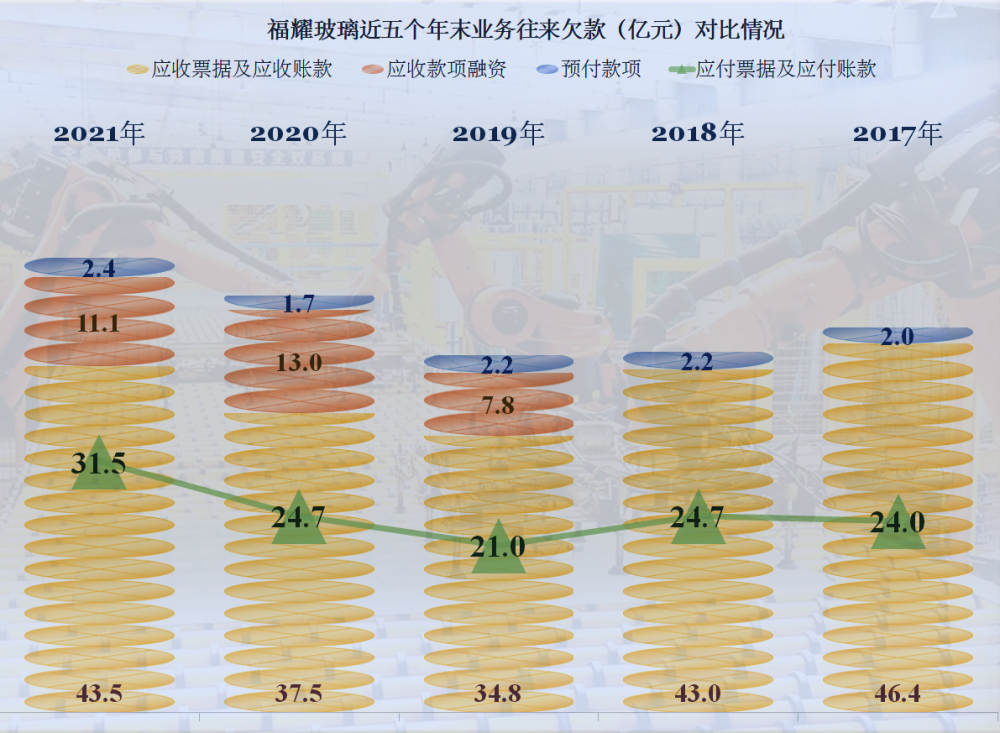 其業務類應收款項偏高,汽車廠家大量欠供應商款項,除了小的配套廠,就連福耀玻璃這種大廠,也不能例外,其應付類業務款項總體相對平衡,略高於應收類款項的一半,福耀玻璃還是沒有把這些欠款,全部轉嫁給自己的供應商,算是比較良心的做法了。