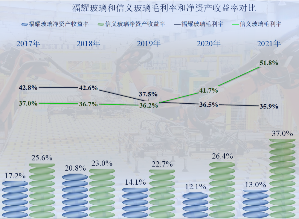 在2017-2108年,福耀玻璃的毛利率更高,2019年兩家基本持平,2020-2021年,信義玻璃開始領先並擴大優勢。不管毛利率高還是低,信義玻璃的淨資產收益率均要高出福耀玻璃不少,這當然和其資產配置和運營效率等有關。