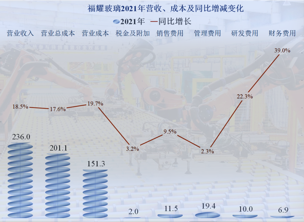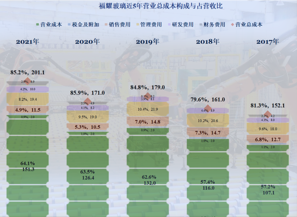 不管是管理提升,還是規模效應,福耀玻璃的期間費用等佔營收比下降了1.3個百分點,不僅抵消了營業成本上升的影響,還讓總成本佔營收比出現了下降。