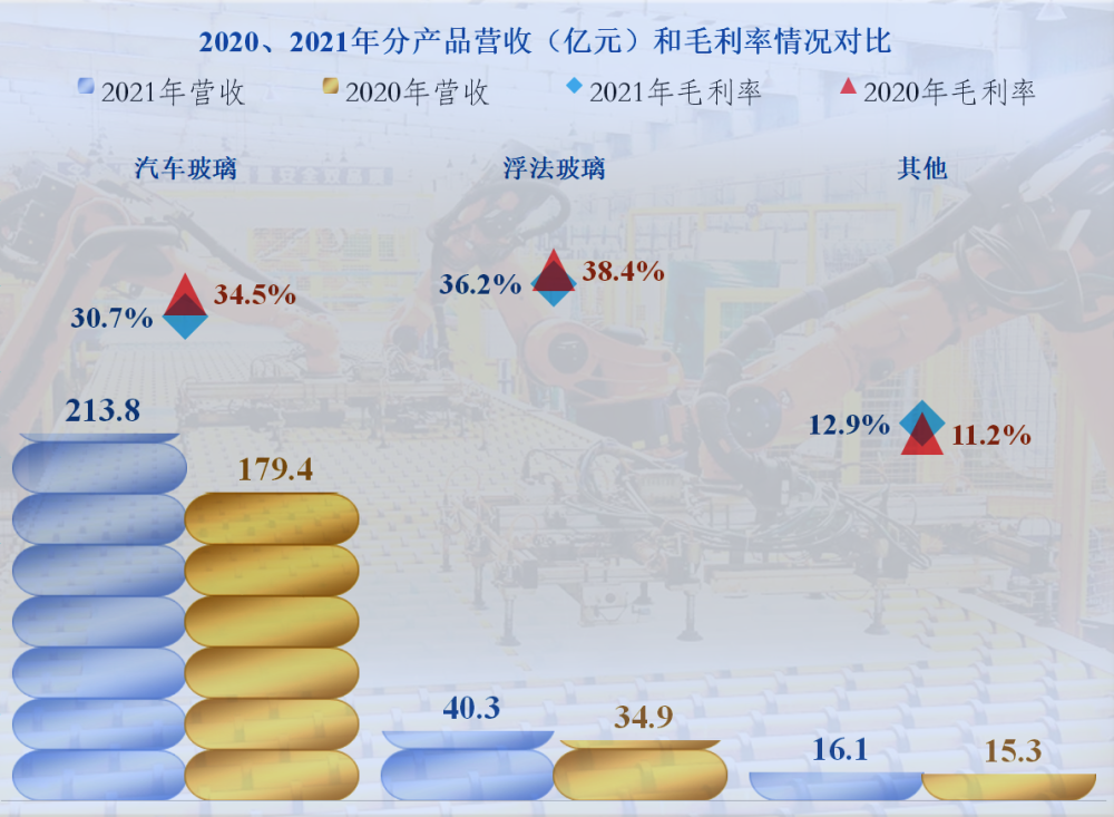 連續兩年,福耀玻璃都是浮法玻璃的毛利率高於汽車玻璃,這讓人比較意外,2021年,兩大產品的毛利率均有所下降。