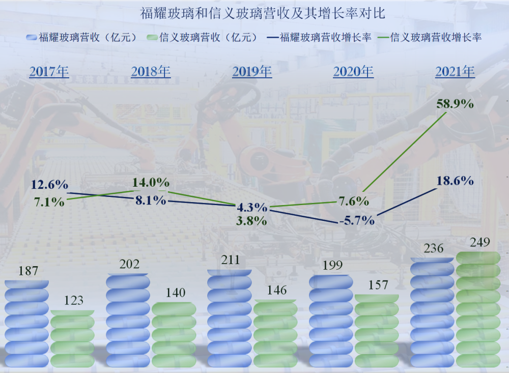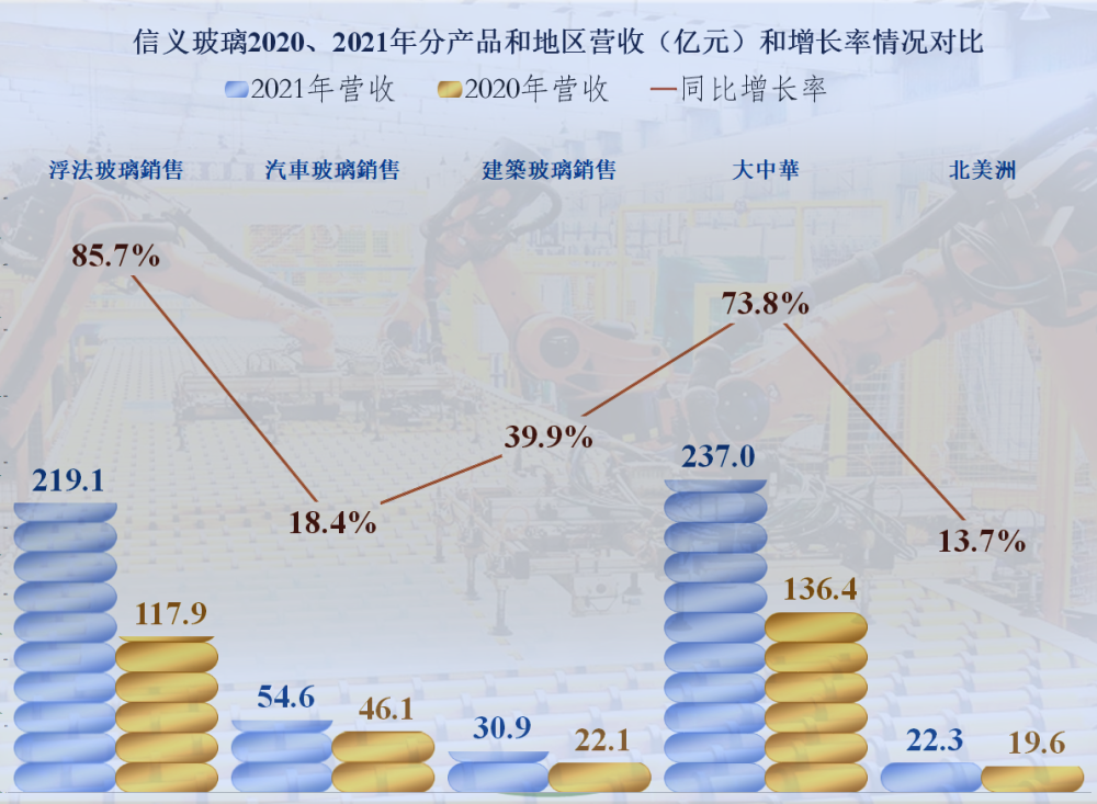 信義玻璃,2021年營收增長了58.9%,比福耀玻璃高出很多,一舉超過了福耀玻璃,這當然與疫情后復工情況和對全球供應鏈的影響,汽車行業的經營形勢,以及大宗商品的漲價等複雜問題相關。