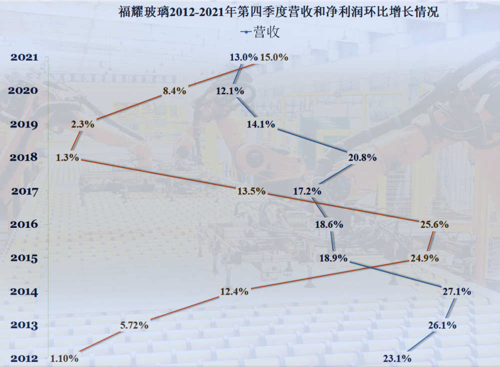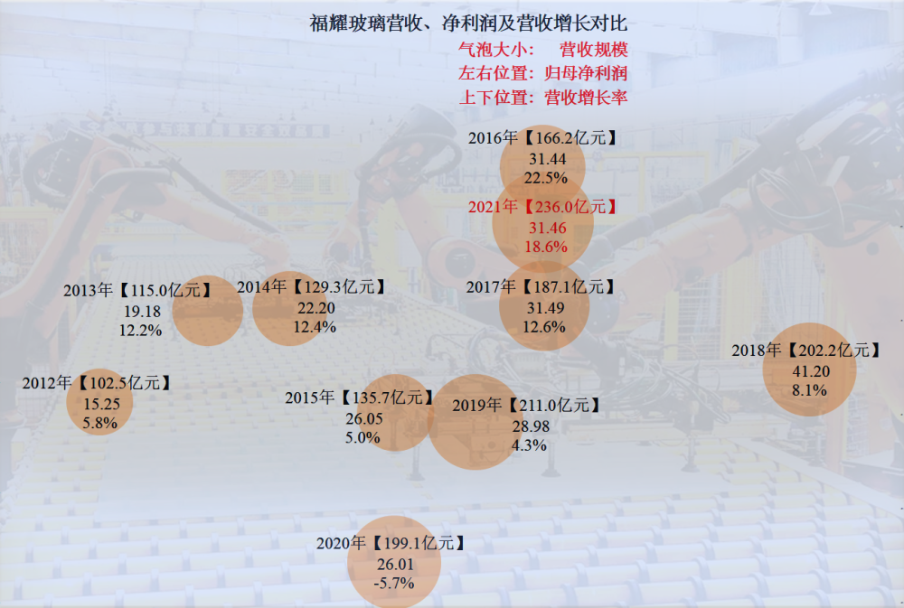 從氣泡圖來看,2021年福耀玻璃以最大的氣泡,位於圖中上部偏右的部分,總體經營形勢不錯,但營收增長率和淨利潤均非十年中的最佳水平,都排在第二,業績表現也是説得過去的。