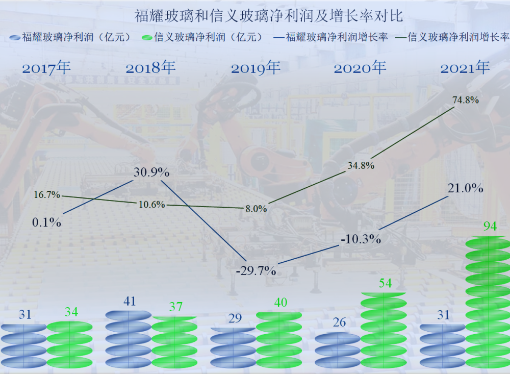 在淨利潤方面,其實信義玻璃早就超過了福耀玻璃,2021年只是將這種領先優勢擴大到了3倍的水平,這也和前面説到的至少三個因素相關。