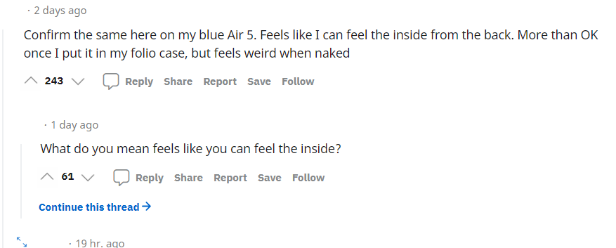 帖子稱,iPad Air 5 的鋁製外殼明顯更薄,會吱吱作響、拿起來輕飄飄,甚至在設備背面輕微施加壓力就能使顯示屏變形。Reddit 上的一個帖子包含大量來自 iPad Air 5 用户的投訴,表示他們對該設備的質量存在擔憂。