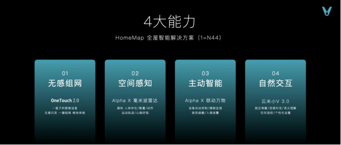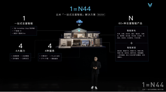 據云米介紹,「1=N44」的1代表「‘一站式全屋智能’解決方案」,即家是一個整體;N是指共計60多種大類的智能「全家桶」產品陣容,集合了智能家電和智能家居兩大產品部門,包括空調、冰箱、洗衣機、煙灶、淨水機、掃地機、智能開關、路由器等;44則是指雲⽶全屋智能解決⽅案HomeMap具有的4大能力:無感組網、主動智能、空間感知、自然交互,以及雲米為用户提供的包括方案設計、OTA持續升級智能體驗、Plus會員、增值服務在內的4種服務。