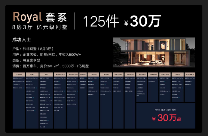 針對不同年收入家庭用户,雲米推出了總價30萬起、20萬以及6-8萬元的智能套系解決方案,分別囊括125件、86件和56件智能產品,對應的是8房3廳的別墅、5房2廳的豪宅以及3房2廳的洋房。