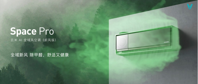 比如Space Pro雲米AI全域風空調(新風版)配有AI 鮮氧新風系統,渦輪風機持續從室外引⼊新鮮空⽓,經過12 級HEPA濾⽹淨化,由導⻛翼導流進⼊蒸發皿,最后穿過全域⻛專利⻛道,深度淨化室外空⽓,釋放新⻛。