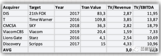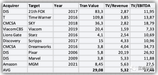 從上面的數據中,我們可以很明顯的看出來,亞馬遜對米高梅的收購支付了很高的溢價。在這個行業中,TV(交易價值)/收入和TV/息税折舊攤銷前利潤分別為3.00倍和12.30倍。而在亞馬遜收購米高梅的案例中,這一倍數已經達到了5.32倍和17.46倍。