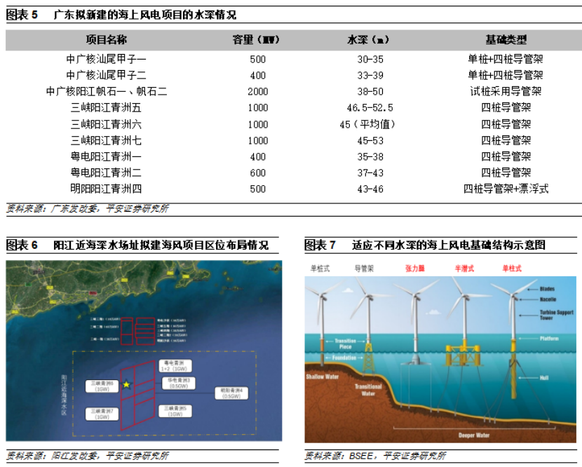 國內海上風電開發已經拓展至超過40米水深的區域。目前廣東新建的海上風電項目主要集中在陽江近海,三峽青洲五六七、粵電青洲一二、明陽青洲四等大型海風項目均處於在建狀態,整體看陽江海上風電的開發已經從近海淺水區向近海深水區延伸,這些項目的平均水深基本達到40米以上。在江蘇市場,2022年1月,江蘇省發改委發佈《關於江蘇省2021年度海上風電項目競爭性配置結果的公示》,射陽100萬千瓦海上風電項目、大豐85萬千瓦海上風電項目、大豐80萬千瓦海上風電項目場址中心離岸距離分別達到60km、33km、67km,明顯高於已建成常規項目的離岸距離,而離岸化往往對應深水化。