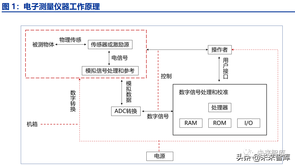 測量過程包括提取信息和轉換信息,數字信號處理(DSP)技術是測量過程的核心。通用電測儀器的測量系統包括三個功能模塊:信號採集模塊(包括傳感器電路、信號調理 電路)、信號分析與處理模塊、結果表達與輸出模塊。其測量過程將首先被測對象的信息 進行提取,后通過 ADC 轉化為數字信號,再利用數字信號處理(DSP)對其進行分析,轉 變為可人工識別的信號。數字信號處理(DSP)就是指用數字運算方法實現信號轉換、濾 波、檢測、估值、調製解調以及快速算法等處理的技術,其具有高精度、可程序控制、便 於集成化等優點。
