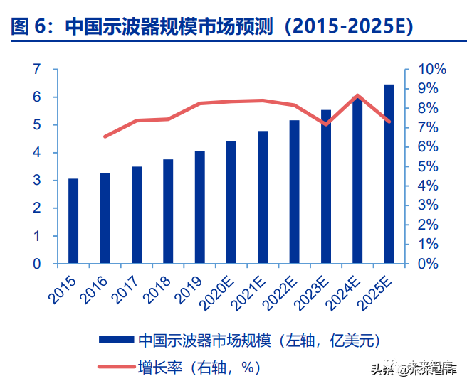 數字示波器的核心性能指標主要為帶寬和實時採樣率。帶寬決定了示波器所能檢測到 的信號頻率範圍,最高帶寬越高,能夠檢測的最高信號頻率越高;而實時採樣率決定了示波器 ADC 在單位時間間隔內可採集的樣本點數,實時採樣率越高,採樣速度越快,失真越 小。2024年示波器全球、中國市場規模將分別達到 16.5、6.0 億美元。根據弗若斯特沙 利文統計,全球示波器市場在2019年達到了12.0億美元,預計未來全球市場規模將以6.5% 年均複合增長率在 2024 年達到 16.5 億美元。2019 年國內市場空間為4.4 億美元,預計將 在 2024 年將達到 6.0 億美元,年均複合增長率 8.1%。