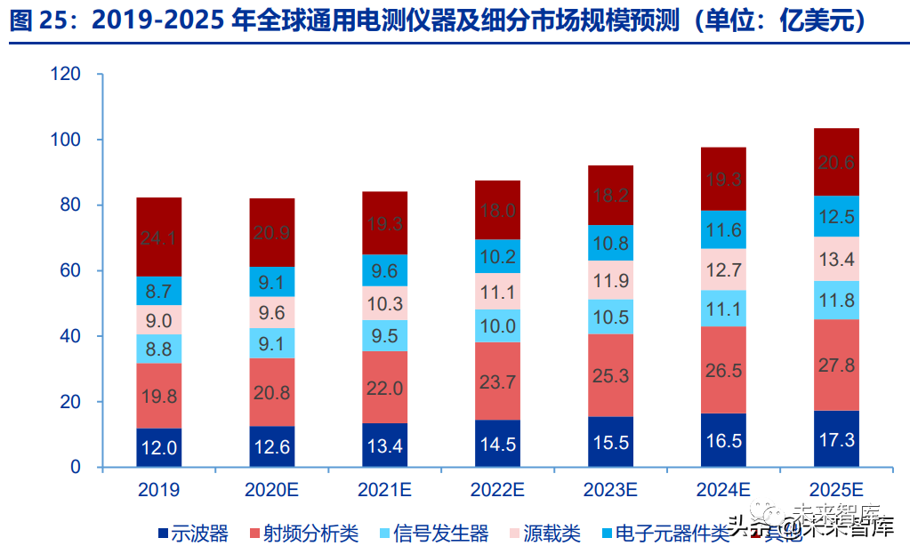預計 2025 年全球通用電測儀器市場規模達到 103.4 億美元,6 年 CAGR 為 3.9%。隨着信息通信 和工業生產的發展,全球電子測量設備的需求將持續增長,預計 2019 年至 2025 年,全球 電子測量儀器行業市場規模將從 137.1 億美元增至 172.4 億美元。按照通用型佔電測儀器 總市場 60%的比例進行測算,預估從 2019-2025 年全球通用電測儀器市場規模將從 82.3 億美元增長至 103.4 億美元,6 年 CAGR 為 3.9%。從細分市場來看,預計 2025 年全球示 波器、射頻分析類、信號發生器、源載類、電子元器件類市場規模分別為 17.3、27.8、11.8、 13.4、12.5 億美元。