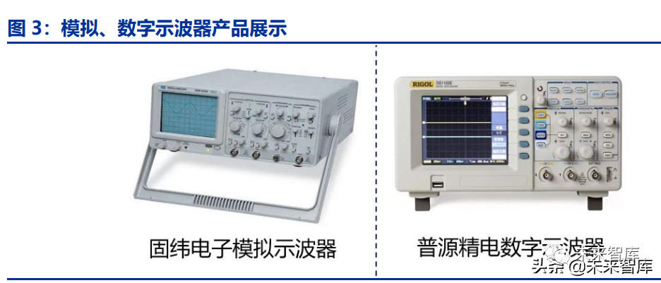 模擬示波器存在明顯缺陷將被數字示波器取代。(1)模擬示波器是直接將被測電信號 呈現在顯示設備上,被測電信號通過控制從左到右掃過示波管的電子束在垂直方向的偏轉來直接描繪出電壓波形。模擬示波器存在沒有存儲數據和分析波形能力、觸發功能有限、 捕獲單次和偶發信號能力不夠等缺陷,加上其內部採用了大量模擬器件,器件性能會隨時 間温度變化而變化,因此性能也較不穩定。(2)數字示波器則是通過模數轉換器把被測電 信號轉換為數字信號,再以 DSP 的方式將信號隨時間的變化波形繪製在顯示設備上,除了 顯示信號的波形,還可對信號進行計算,功能更多。目前,數字示波器幾乎在所有參數都 開始全面超越模擬示波器,未來后者被其取代不可避免。