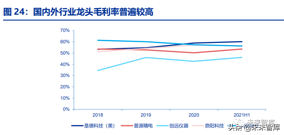 高壁壘形成深厚護城河,行業龍頭產品附加值高毛利率高。行業龍頭具有強 know-how 屬性,高壁壘形成深厚護城河,所以一般龍頭企業擁有較強的定價權,尤其是高端產品附 加值高,銷售利潤空間大。從毛利率來看,國際龍頭是德科技毛利率維持在 50%以上,2021 年上半年毛利率超過 60%。國內龍頭目前產品銷售仍以中低端為主,但 2021 年上半年同 惠電子、普源精電、鼎陽科技毛利率均超過 50%,創遠儀器毛利率也達到 46.2%。