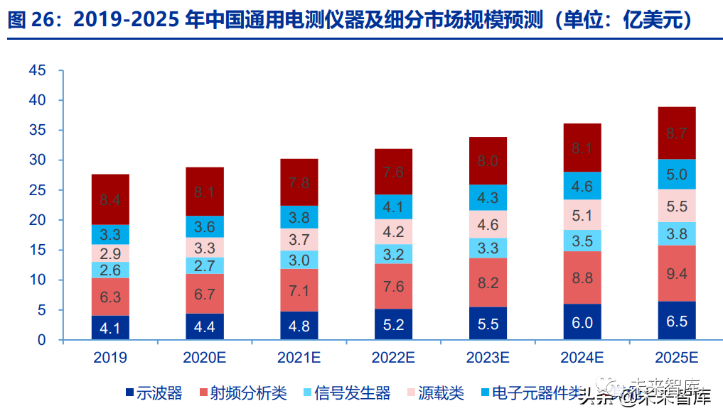 預計 2025 年我國通用電測儀器市場規模將達 38.9 億美元,6 年 CAGR 為 5.8%。2019-2025 年, 中國電測儀器的市場規模將從 46.1 億美元增長至 64.8 億美元,同樣按照通用型佔電測儀 器總市場 60%的比例進行測算,預計通用電測儀器市場規模將從 27.7 億美元增長至 38.9 億美元,6 年 CAGR 為 5.8%。從細分市場來看,預計 2025 年中國示波器、射頻分析類、 信號發生器、源載類、電子元器件類市場規模分別為 6.5、9.4、3.8、5.5、5.0 億美元。