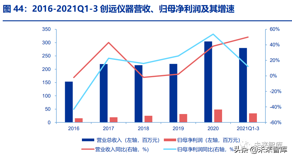 創遠儀器是一家自主研發射頻通信測試儀器,並提供整體測試解決方案的專業儀器儀 表公司。公司自研業務分為五大系列,持續推進「1+3」戰略,多品類發力助推長期發展。公司主營業務分為自研產品和解決方案以及貿易業務。其中,自研產品和解決方案擁有自 主知識產權和相關核心技術,目前主要分為五大產品線,其中信號模擬和信號發生、信號 分析與頻譜分析、無線電監測與北斗導航測試增長勢頭強勁,2021H1 增速分別達到 416.8%、111.7%、78.0%,同期矢量網絡分析類產品銷售有較大幅度下滑,同比下滑52.9%, 同期無線網絡測試與信道模擬業績穩定,同比增長 9.6%。