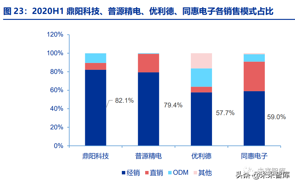 下游分散造就行業普遍以「經銷為主」的銷售模式。通用電測儀器下游客户分佈較廣, 且儀器銷售的本地化服務較多,採取經銷商為主的模式符合行業的產品特點,有助於發揮 經銷商本地化、專業化的分銷優勢,實現產品的快速銷售和市場覆蓋,故行業里公司採取 「經銷為主、直銷為輔、少量 ODM」的整合式銷售模式。國內龍頭鼎陽科技、普源精電、 優利德、同惠電子經銷收入佔比均超過 55%。