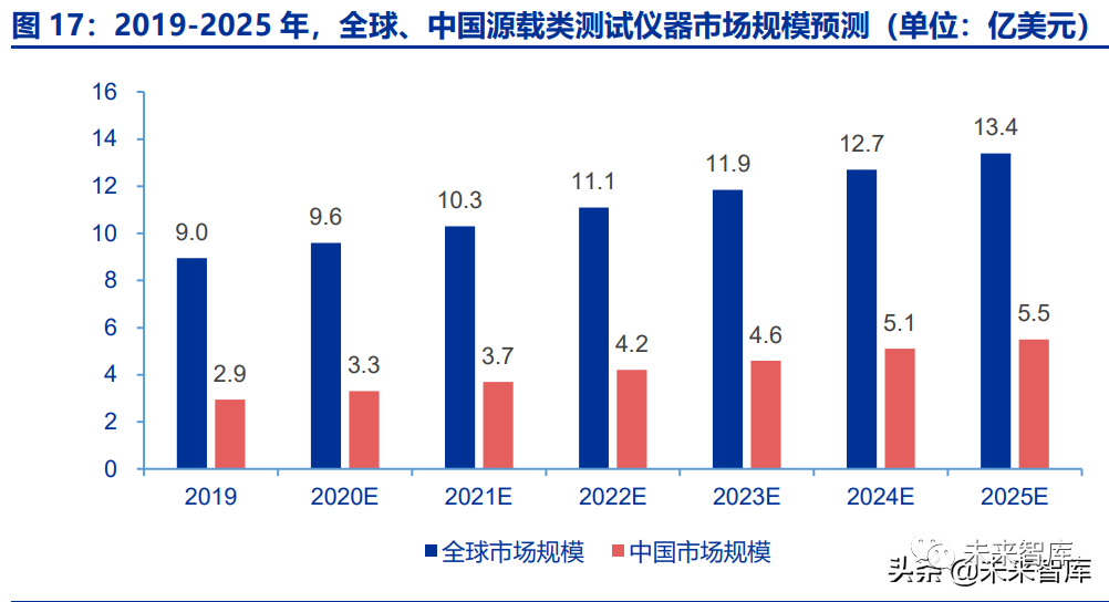 預計 2025 年全球、中國源載類測量儀器市場空間為 13.4、5.5 億美元。(1)全球: 受益於新能源產業蓬勃發展,2019-2025 年市場規模將從 9.0 億美元增至 13.4 億美元, CAGR 為 7.0%。(2)國內:國內新能源產業增速高於海外,從 2019-2025 年,預計國內 源載類測量儀器市場規模將從 2.9 億元增至 5.5 美元,CAGR 為 11.0%。