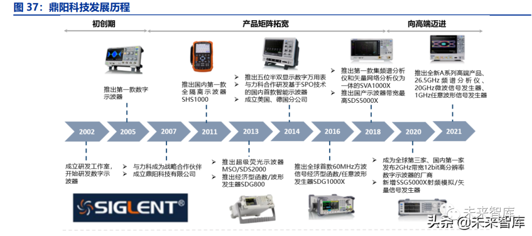 歷經三時期,擴品類並邁向高端化。(1)初創期(2002-2007):成立研究室推出 首款數字示波器產品,2007 年設立鼎陽科技,后與全球高端示波器領導品牌力科成為戰略 合作伙伴。(2)拓寬產品矩陣期(2008-2018):發力數字示波器,先后在不同產品端 取得國產化零到一的突破,並協同四大主力產品發展。同期,在國內外成立多家子公司, 完善全球營銷體系佈局全球市場。(3)高端化期(2019-2021):致力於創新型產品研 發,2021 年推出三款全新 A 系列產品,實現從基礎產品研發到高端科學儀器研發的跨越。