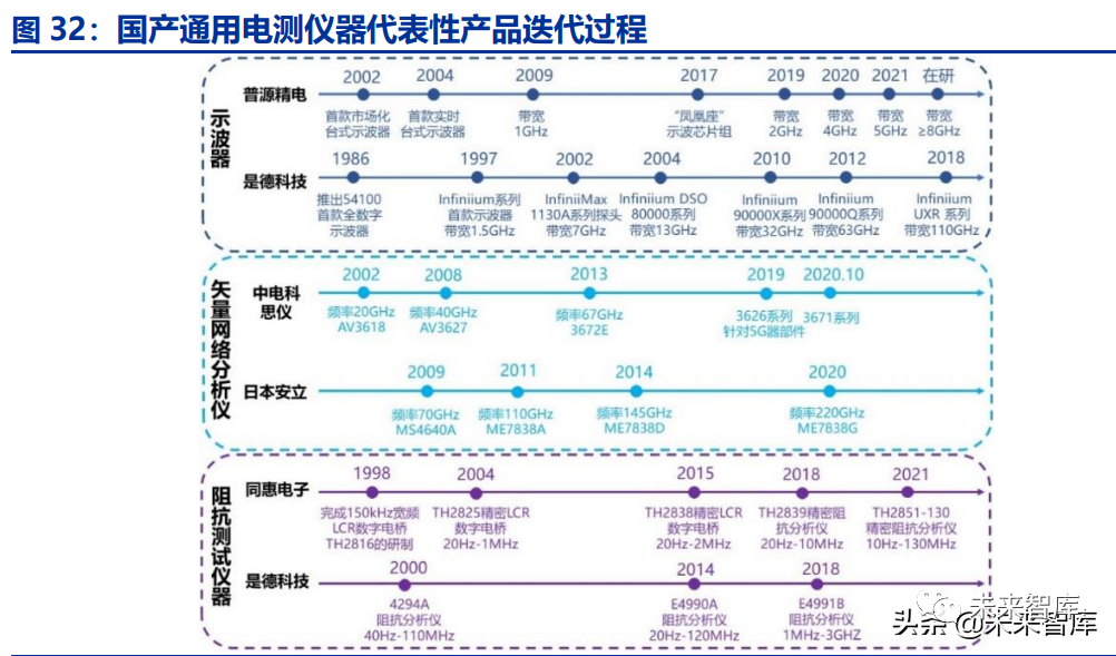 國產厚積薄發高端化突破,與海外代差縮小。以部分代表性通用電測儀器為例,(1) 數字示波器:普源精電 2017 年推出自研「鳳凰座」芯片,后續三年內基於「鳳凰座」成功 研發帶寬 2GHz,4GHz 產品,2021 年推出國內首款最高 5GHz 帶寬、20GSa/s 實時採 樣率的 DS70000 系列數字示波器,但與海外技術水平仍有較大差距。(2)矢量網絡分析 儀:中電科思儀 2013 年時,推出的 3672 系列產品最高測試頻率可達 67GHz,國際領先 日本安立 ME7838G 最高測試頻率 220GHz,國內外差距為近 2 代左右,目前中電科思儀 正向 5G 寬帶產品深耕,與海外先進差距有望進一步縮小。(3)阻抗測試儀器:同惠電子 2021 年推出精密阻抗分析儀 TH2851-130,最高測試頻率達 130MHz,已超越是德科技 前代產品 E4990A,與是德差距縮小到 1 代,填補了國產阻抗分析儀高端產品空白。