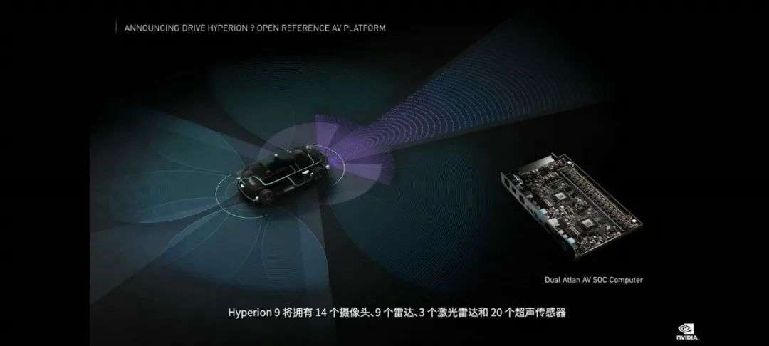 Hyperion 9所採用的是Atlan芯片。Atlan芯片在GTC 2021大會上推出,在現有Orin芯片基礎上對整體芯片架構進行了大變革,將集成Grace-Next CPU、Ampere-Next GPU單元,並首次集成Bluefield 數據處理單元(DPU),起到協助AI運算、加強自動駕駛能力的作用。
