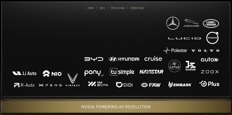 英偉達還宣佈兩家新增的新車企合作伙伴:比亞迪和Lucid Group。目前,已有超過25家車企及自動駕駛公司選擇了英偉達。這些合作伙伴將在未來6年內,為英偉達貢獻超過110億美元的營收。