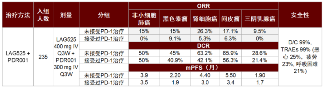LAG525治療實體瘤還沒有體現出具有競爭優勢的臨牀獲益。諾華首先開展了LAG525與PDR-001及卡鉑聯用治療1L/2L未接受ICI的晚期三陰乳腺癌的臨牀試驗,首要終點ORR未達到,並且LAG525+卡鉑有一例治療相關死亡。從2020年和2022年Journal for ImmunoTherapy of Cancer、以及2019 ASCO公佈的兩項臨牀試驗(NCT02460224和NCT03365791)數據來看,LAG525+ PDR-001聯用治療晚期惡性腫瘤的II期結果效果不具有顯著優勢。在NCT02460224臨牀試驗中,共有134名患者接受了LAG525單藥治療,121名患者接受了LAG525+PDR-001聯合用藥,98%的入組實體瘤患者接受過中位數為3的先前系統性化療或者靶向療法,聯合用藥組CR 2.5%,PR 8.3%,SD 28.9%, 雖然安全性可控,沒有出現限制劑量毒性,但是98.3%的患者停止治療,其中73.6%因為疾病惡化而停止。