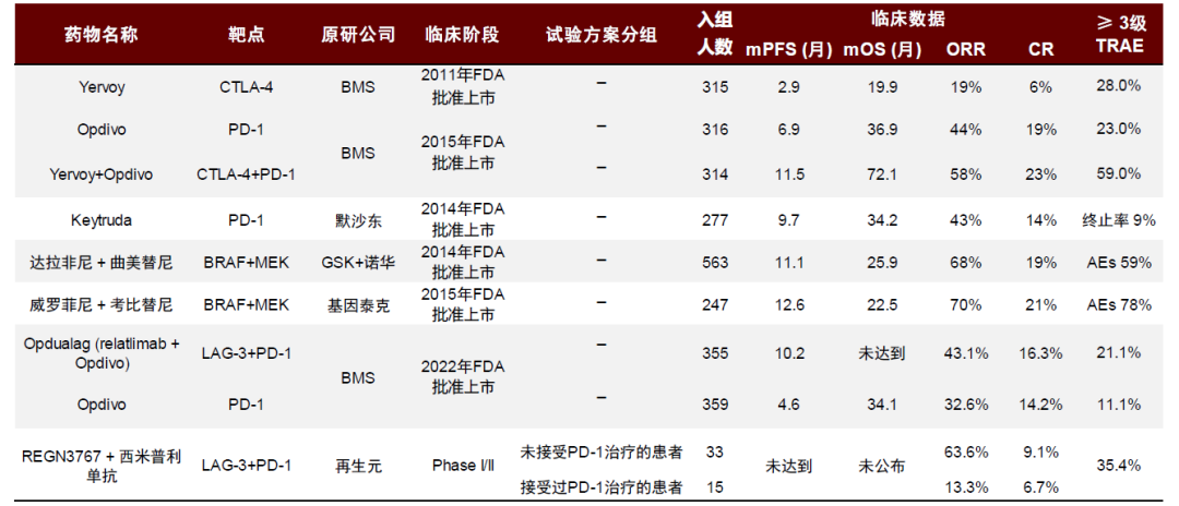 已經獲批的BMS研發的relatlimab以及正在臨牀II期的再生元的REGN3767均是LAG3拮抗型單抗,已經開展並公佈了聯用PD-1單抗治療1L晚期黑色素瘤的臨牀數據。黑色素瘤是實體瘤中較容易取得療效的瘤種,而且市場規模較大,雖然競爭激烈但未來商業化放量仍有進一步提升空間。