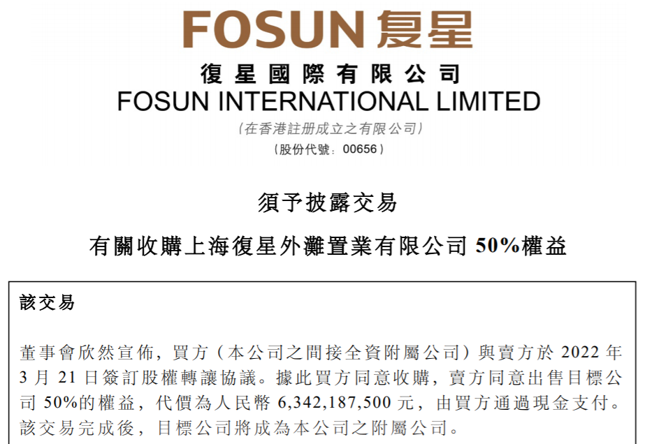 3月21日晚間,復星國際有限公司(00656.HK,以下簡稱復星國際)公告稱,計劃以63.42億元的代價收購中融信託持有的外灘金融中心(BFC)50%股權。物業估值報告顯示,截至2021年12月31日,BFC物業的價值約為230.78億元。