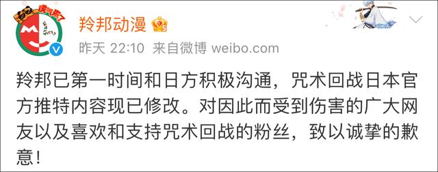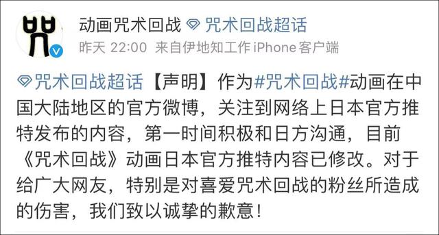 昨晚,《咒術回戰》在中國大陸的官微@動畫咒術回戰 發佈道歉聲明稱,對於給大家造成的傷害,深表歉意,聲明同時表示,關注到網絡上日本官方推特發佈的內容,第一時間積極和日方溝通,目前《咒術回戰》動畫日本官方推特內容已修改。