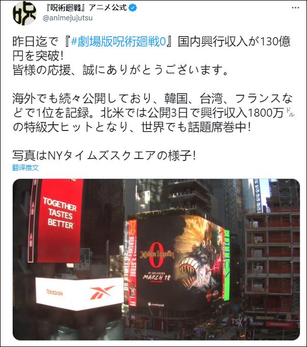 昨天,動漫官方在推特上發佈喜訊,稱截至21日,劇場版在日本國內的票房超過130億日元(約合人民幣6.8億),在北美、韓國等市場也關注度頗高,同時配上了一張紐約時代廣場上該片的廣告圖。