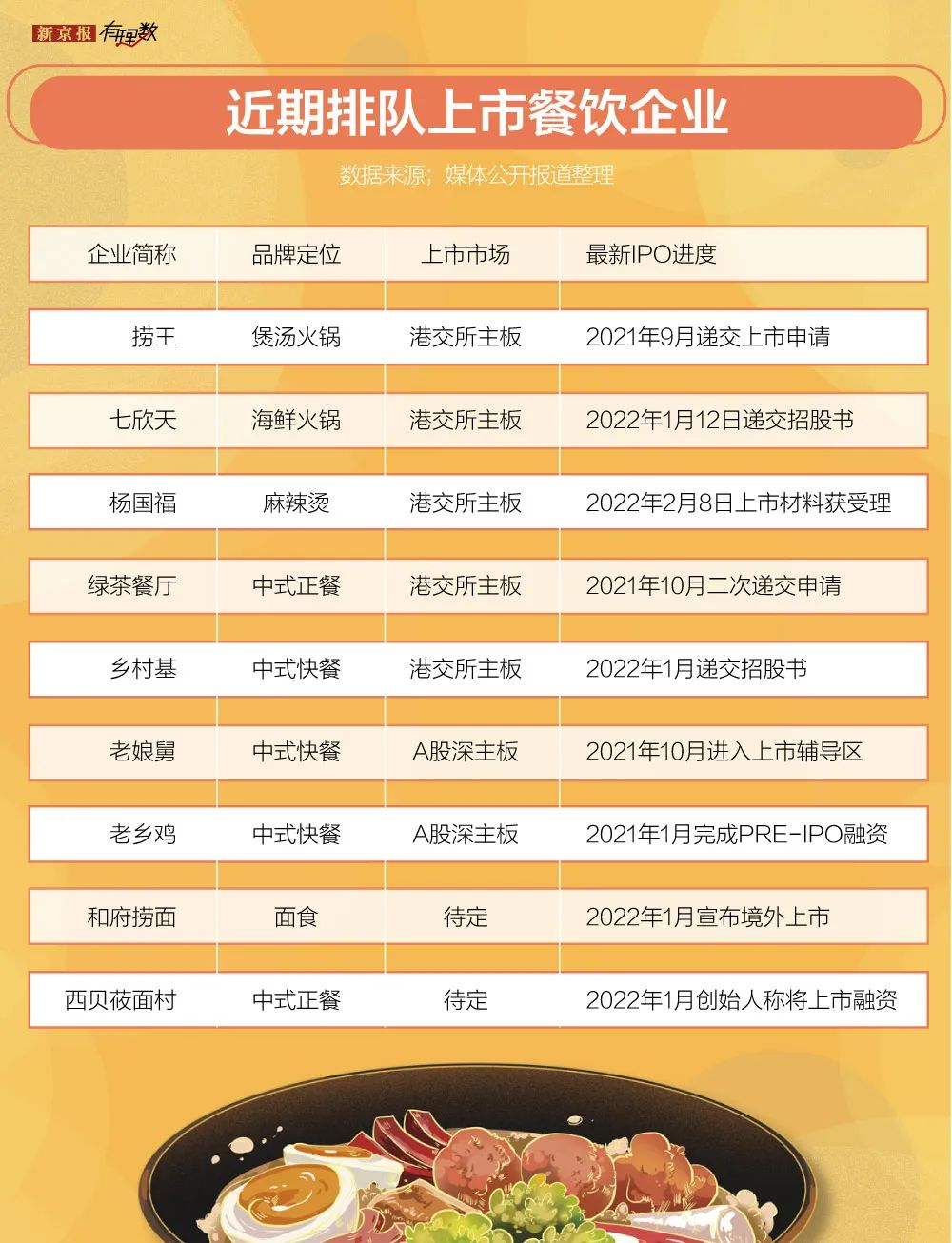 除上述企業,還包括衝擊港股的海鮮火鍋連鎖餐廳七欣天、二次遞交上市申請的鄉村基等。這些尋求上市的餐企中,選擇港股上市的佔據一半,包括楊國福、七欣天、鄉村基、和府撈麪。選擇A股上市的佔三分之一,包括老鄉雞等品牌。