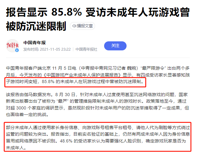 根據《中國遊戲產業未成年人保護進展報告》指出: