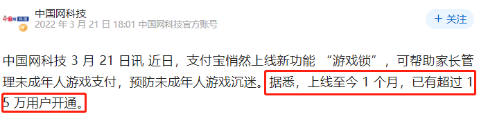 而且據中國網科技報道,「遊戲鎖」上線至今,已經有 15W 用户開通。