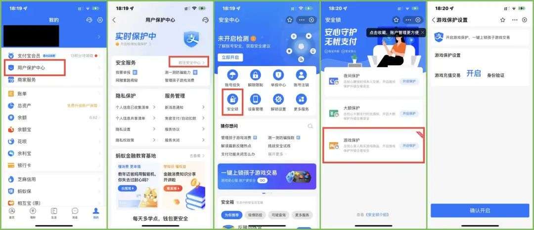 進入「我的」——「用户保護中心」——「前往安全中心」——「安全鎖」——「遊戲保護」。