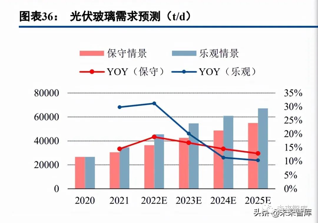 在未來,光伏玻璃需求呈現結構性分化特徵,大尺寸玻璃需求將快速提升。由於大尺寸、雙玻組件的市佔 率提升,不同類型的光伏玻璃需求顯著不同。對於傳統尺寸光伏玻璃(166mm 組件玻璃),未來需求將快速減 少,2024 年將從市場退出;對於大尺寸光伏玻璃(182mm 及 210mm 組件玻璃),未來需求將大幅提高,保守情 景和樂觀情景下,未來四年 CAGR 分別為 38.4%和 41.1%,2022 年需求同比分別提升 111%和 113%。(報告來源:未來智庫)