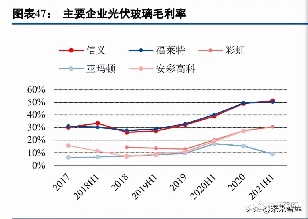 2021 年前三季度公司實現營業收入 63.37 億元,同比增長 57.78%;淨利潤 17.17 億元,同比增長 111.50%。2021 年上半年,公司毛利率 48.04%,其中光伏玻璃毛利率 50.29%。過去三年公司營業收入均保持在 30%以上 的增速水平,淨利潤不斷提升,一方面由於公司光伏玻璃產能在過去三年中快速釋放,另一方面光伏玻璃在 2020 年下半年價格一路走高,盈利性大幅提升。