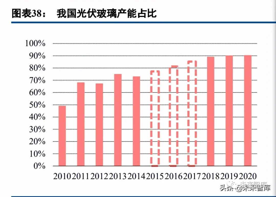 隨着技術突破及成本優勢,國內光伏玻璃廠商產能逐漸提升,保持在 90%佔比。2006 年之前,我國並不具 備光伏玻璃國產化技術,市場基本由聖戈班、皮爾金頓、旭硝子、板硝子四家外國公司壟斷,進口價格高達 80 元/平方米以上。2006 年,福萊特打破國外技術壟斷建立第一條光伏玻璃產線,在市場需求和利潤的驅動下,國 內光伏玻璃行業快速發展,由於成本優勢,國內企業迅速佔據市場份額,國外企業紛紛退出光伏玻璃市場,到 2018 年,國內企業生產的光伏玻璃全球市佔率接近 90%。