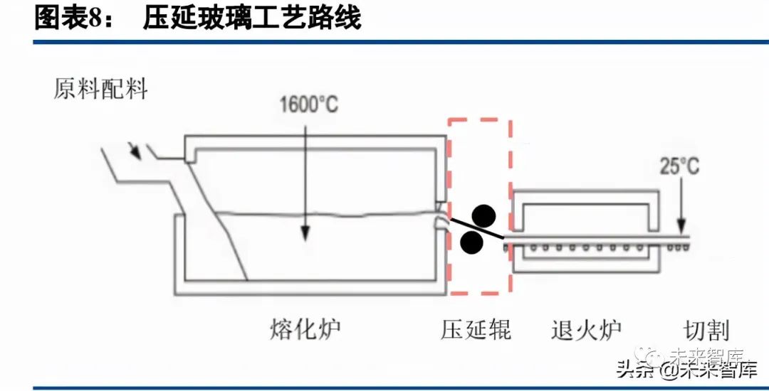 應用於光伏組件的玻璃主要分為超白壓延玻璃與超白浮法玻璃,二者工藝路線差異顯著。①超白壓延玻璃 工藝:生產線主要由原料配料系統、玻璃熔化系統、壓延成型系統、退火系統、檢驗裁切系統以及后續的精加工系統組成。由於光伏玻璃對於透光率的要求極高,因此在原料配料系統中需嚴格控制鐵含量。合格的配合料 在玻璃熔化系統中經過高温加熱熔融,形成透明、純淨、均勻的玻璃液。隨后玻璃液由池窯沿流道流出,冷卻 過程中,在壓延成型系統中用帶有圖案花紋的輥軸壓制形成玻璃製品,再送入退火爐退火,以滿足玻璃的應力 要求。從退火爐出來的連續玻璃基板,經過檢驗、切邊、切割等工序,為后續精加工提供符合質量要求的原片。在玻璃原片基礎上進行鍍膜、鋼化等深加工處理最終形成成品。覆蓋在光伏組件上的光伏玻璃經過鍍膜后,可以確保有更高的光線透過率,使太陽能電池片可以產生更多的電能;同時,經過鋼化處理的光伏玻璃具有更高 的強度,可以使太陽能電池片承受更大的風壓及較大的晝夜温差變化。②超白浮法玻璃工藝:通過錫槽成型系 統形成玻璃板。在該系統中,來自池窯的玻璃液在錫槽中漂浮於熔融錫液表面,完成攤平、展薄、拋光、冷卻、 固型等過程。由此可見,不同生產類型企業的轉產存在工藝限制。