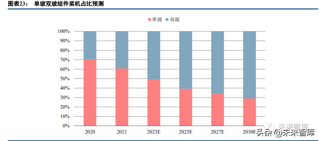 除發電增益外,雙玻組件在耐久性、機械強度、透光性等方面具備優勢,佔比有望逐年提升。作為無機材 料,玻璃具備很好的耐久性,可以有效避免自身老化帶來的組件功率衰減或失效;雙玻組件採用兩面玻璃的對 稱結構,機械強度進一步提升,不易產生隱裂,同時也避免了施工安裝過程中背板劃傷的風險;此外,雙玻組 件具備透光性能,未來在光伏建築一體化(BIPV)領域有望得到更加廣泛的應用。根據 CPIA 的數據,2020 年, 隨着發電系統端對於雙玻組件發電增益的認可,以及美國對雙玻組件 201 關税的豁免,雙玻組件市佔率快速擴 大至 29.7%。預計隨着光伏玻璃供應能力的快速提升,雙玻組件的應用規模將進一步擴大,到 2023 年市佔率將 達到 50%左右,到 2025 年市佔率進一步提升至 60%左右。