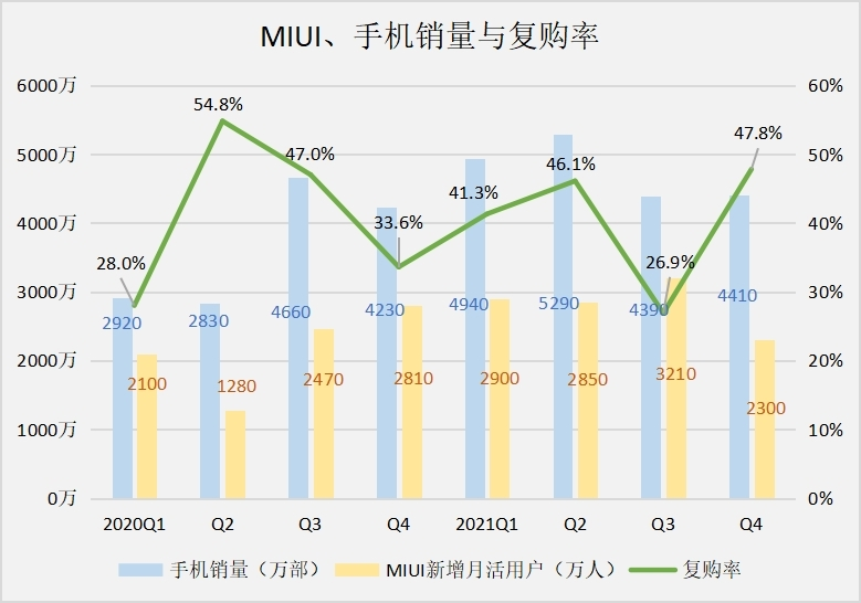 小米對高端特別執着,所以從小米11、11ultra等機型開始就一直在不斷堆料。然而,除了米粉之外似乎其他用户對「高端化」后的小米仍不感冒,而更讓小米欲哭無淚的是復購率在去年Q3也出現了下跌為26.9%,創下了近三年來最低的紀錄。